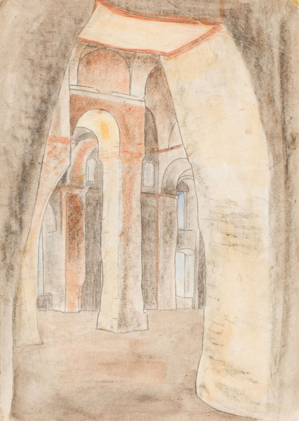 Interior of an Old Christian Temple Viewed through Archway, watercolour, pencil and crayon on paper, approx. 14” x 10”, ca. 1930
