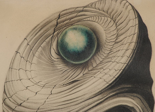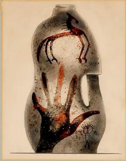 A similar drawing of the same size, in the same sale, was listed by the auctioneer as “Hand in Jar” but a more accurate description would be jar with primitive Lescaux-style motifs; signed B Cybis at lower right. The vessel shape instantly reminded me of a plastic gallon-size milk container, although I don’t think they had those during the 1940s!