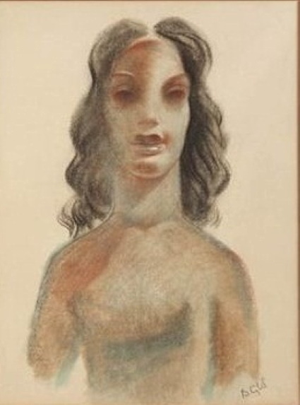 This pastel-on-paper drawing of a long-haired woman was described by the seller only as “after 1939”. It’s unclear whether the dimensions of 16″ wide and 22″ high referred to the image only, or to the overall framed size. Signed B Cybis in pencil at the lower right.