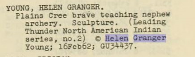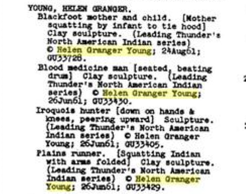 shows that the sculpture had been created and copyrighted nine years earlier (1962) by Helen Granger Young on commission for a company called Leading Thunder, for inclusion in their ‘North American Indian series.’ No search engine has been able to turn up anything about a company by this name, but obviously it did exist at some point during the early 1960s. Perhaps they went out of business before ever producing any goods? In any event, this sculpture ended up being sold to Cybis for use as the ‘Magic Boy’ limited edition in the 1970s and again (in color) in the 1980s. Nowhere in any Cybis advertising literature is Helen Granger Young credited as the designer – but then again, they never credited her for any of the other Cybis pieces either. The difference, of course, is that those other pieces were eventually copyrighted by Cybis, while this one had already been copyrighted by Mrs. Young during the previous decade.