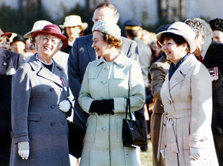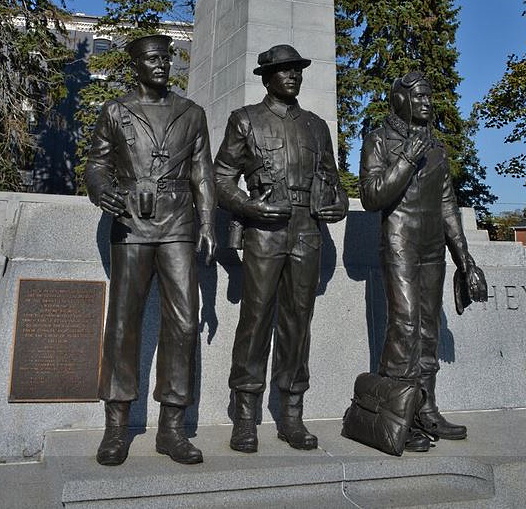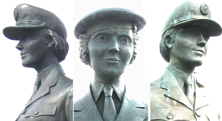 The Tri-Service Memorial, on Memorial Boulevard in Winnipeg, honors the women who served in Canada’s army, navy and air force during both World Wars. The design of the monument came from Beryl Isabel Simpson, then-president of the Women’s Tri-Service Veterans Association, but the actual sculpting was done by Helen Granger Young. The monument was unveiled in July 1976 but Queen Elizabeth’s schedule did not allow her to attend. The monument was re-dedicated during the Queen’s 1984 tour of Canada; she herself had served as a mechanic and military truck driver during World War II.