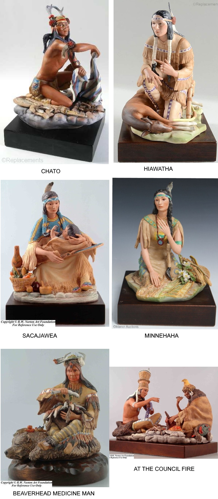 This collage shows the first six of Helen Granger Young’s pieces that were produced as limited editions by Cybis. From the top left, they are: Apache ‘Chato’ (1974); Onandaga ‘Hiawatha’ (1969); Shoshone ‘Sacajawea’ (1971); Dakota ‘Minnehaha’ (1969); Blackfoot ‘Beaverhead Medicine Man’ (1969); and ‘At the Council Fire’ (1973.)