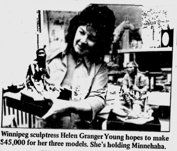 Models of Hiawatha, Minnehaha (in plasticine) rode in first class seat on Air Canada from Winnipeg to NY at half fare. Beaverhead in a box on the floor in front of her seat. Mrs Young didn’t know it then, but […] ultimately her three Indian sculptures, done in her Winnipeg home, would result in gross sales of $2.5 million. Her share? She doesn’t like to discuss it. She gets a royalty on each copy sold. She hopes to receive at least $15,000 per statue.