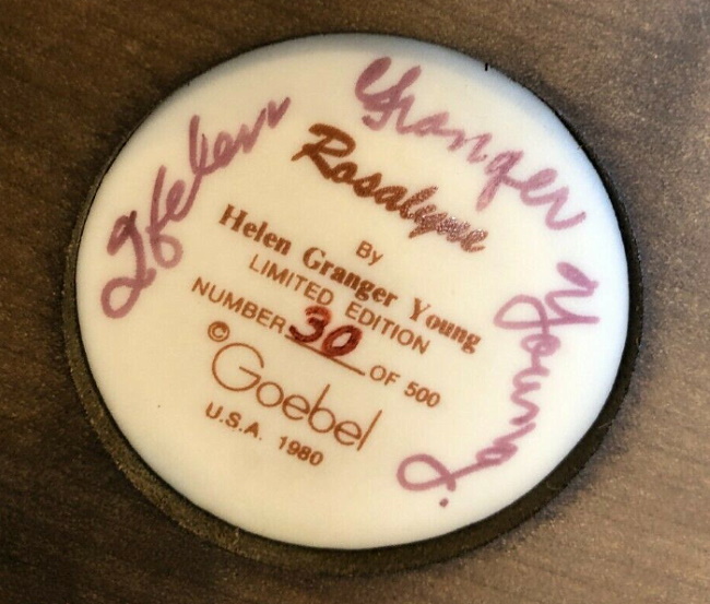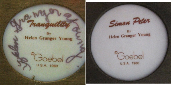 The typical open-edition Goebel backstamp for the Helen Granger Young series, one autographed and one not.