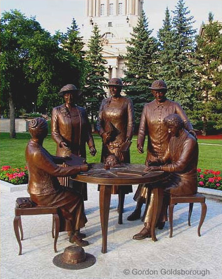 This is the Famous Five Monument on the grounds of the Manitoba Legislative Building. It was commissioned by the Nellie McClung Foundation at a final cost of $750,000 CDN and unveiled in June 2010. The group portrays Judge Emily Murphy, Henrietta Muir Edwards, Irene Parlby, Louise McKinney and Nellie McClung – all of whom brought a case to the Supreme Court of Canada to reverse a 1928 decision that women could not hold a Senatorial office because they were not “persons.” Needless to say, they won the case, and there is an excellent YouTube video showing the creation process of this Famous Five monument.
