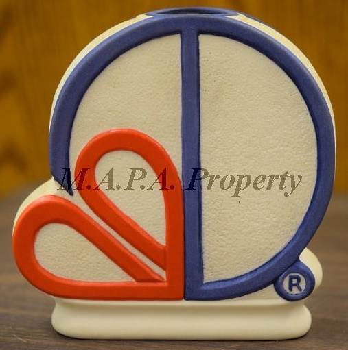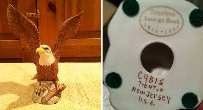 In 1994 the Trenton Savings Bank requested a commemorative piece for their 150th anniversary. Cybis used the mold from their 1990 open-edition introduction Young Eagle which had already been re-used by them in 1992 as a “new” (quotes deliberate) retail piece called Bald Eagle, removed the wood base, and added marks on the underside. This is one of only three known instances (so far) when Cybis used a decal rather than hand-writing everything on their items. Clearly, their client (the bank) wanted their anniversary logo on the commissioned item and a decal was the only way to do that. The production quantity is unknown.