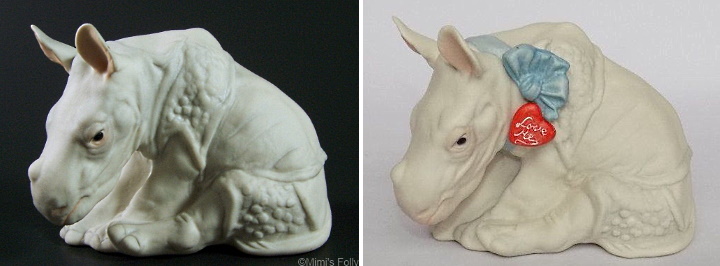 This piece had two standard retail versions: Baby Rhino ‘Monday’, available from 1985 onward (at left), and Baby Rhino ‘Love is Blind’ from 1987 onward. The version with the butterfly on his nose (snatched from the retired 1960s Pansies pieces) was a REP at some point during the late 1980s. They were not numbered.
