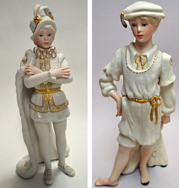 The studio did produce a version of The Prince in 1996 for its special Collector’s Society piece which they called the Golden Prince. Shown at left in this image, the Golden Prince’s decoration is not the same as whatever the “mystery gold-and-white” prince was; not only does he have a crown instead of a plumed hat, but the Golden Prince actually has less gold decoration! This seems illogical until one remembers that in 1996 the studio no longer had a full-time staff of artists, and the ones who were available were not the same ‘crew’ who were around during the 1980s.