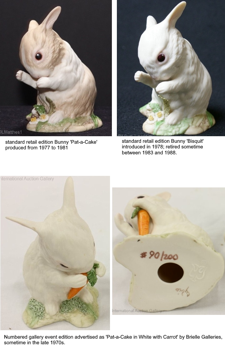 The top two bunnies were both retail editions. Bunny ‘Pat-a-Cake’ was made from 1977 to 1981. The white Bunny ‘Bisquit’ was introduced in 1978 and retired sometime between 1983 and 1987. The REP, from the late 1970s, was called Pat-a-Cake in White with Carrot and was a numbered production run of 200. It is Bisquit with a carrot added and the base given a different treatment: moss instead of daisies and leaves. This REP is extremely unusual in that the edition size is indicated along with the numbering; it is the only Cybis design (regardless of type, edition, or purpose) that I have ever seen with this numbering format. Normally, only the sculpture number is shown, never the edition size. I know that the piece shown above is not a one-off because we had one of these, and ours was numbered the same way.
