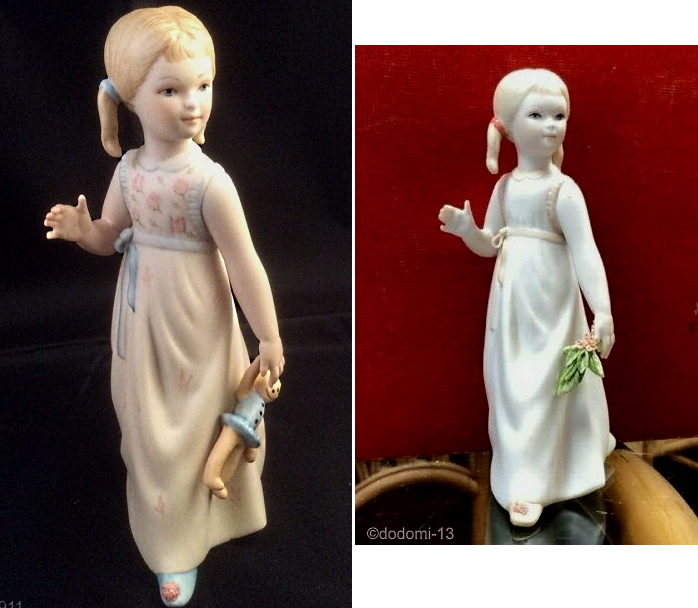 This one is a “possibly”, because the outlier example was among the items in the studio’s 2019/2020 liquidation sales and thus could instead just be a test piece. The upper image shows two normal retail versions. The one with the yellow-trimmed dress is Clarissa, introduced in 1986. The other, with the flowers replaced by hearts and with a small heart in her hand, is Little Heart who appeared in 1987 in the studio’s new “Sweetheart/Valentine” category.