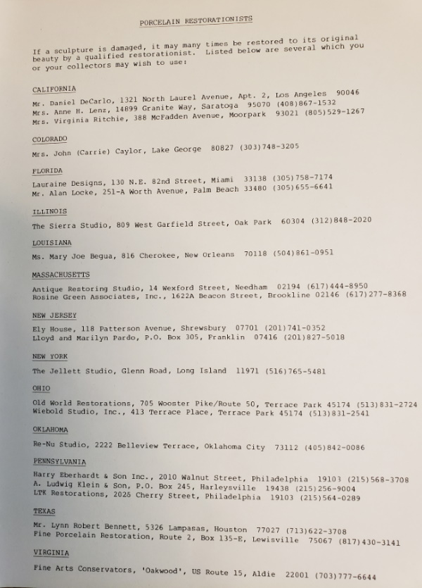 The list includes 13 states (California, Colorado, Florida, Illinois, Louisiana, Massachusetts, New Jersey, New York, Ohio, Oklahoma, Pennsylvania, Texas and Virginia) and lists 22 professional porcelain repair services. I checked to see if any of them still exist today, two decades later. Only three of them remain, and they are noted in the list below; two of them are in the same city. By the way, there is no such word as “restorationist” in this context, so don’t bother Googling for one; the only definition of this word refers to an adherent to a specific type of religious dogma.