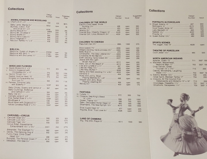 1974 saw some noticeable changes in the marketing format. The New Releases heading is now Introductions and the rest of the price list is headed Collections. The Personages collection was renamed Portraits in Porcelain, and two new collections were added: Carousel and Fantasia. In addition, every Collection group now contains all of the available sculptures within them – both limited and non-limited – instead of separating them. This made the list much more user-friendly. The total Collection count was now 11, plus the Limnettes which were separate and would disappear as an available series shortly thereafter.