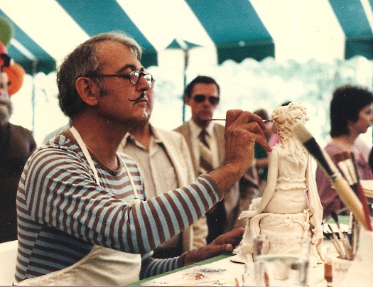 As the scope of the events grew, the tents would house special displays (as in the top photo, with Cybis art director George Ivers painting a Persephone) and even stages for special performances or guests such as Tony Randall (lower photo.) To showcase the Cybis Chess Set event in Ira’s 1979 show, a Grand Master played 20 simultaneous games within a tent; later, costumed madrigal singers and jongleurs entertained the guests. Cybis collectors awaited their invitations to the Brielle shows with great anticipation, and it wasn’t unusual to be chatting there with people who had flown in from all parts of the country as well as Canada and Europe.