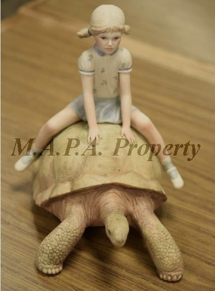 But getting back to the Cybis piece: We don’t know when the original front legs of the box turtle mold were re-worked to make them look like a tortoise’s, other than that it had to have been sometime between 1974 and 1985. The rider offers a clue, because stylistically she resembles some of the Children to Cherish pieces designed by freelance artist Dolores Valenza between 1977 and 1980. This particular mold was not used for any retail piece, but I would bet a box of Godiva that there was a ‘children on a see-saw’ somewhere along the line that never made it to a retail introduction; the girl’s posture is exactly what would be needed for that.