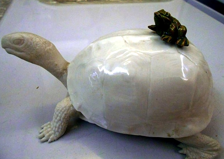 The original neck was removed, leaving the head to be attached to the very front edge of the shell opening by ‘folds’ of porcelain. Both ends of the front legs were cut off, leaving only the section between the original knee and ankle joints; this was repositioned horizontally and some long claws were added to the exposed end. Although this position may look awkward, it actually is the way a turtle holds its front legs when in a resting pose – neither fully inside its shell nor fully extended for standing or walking.