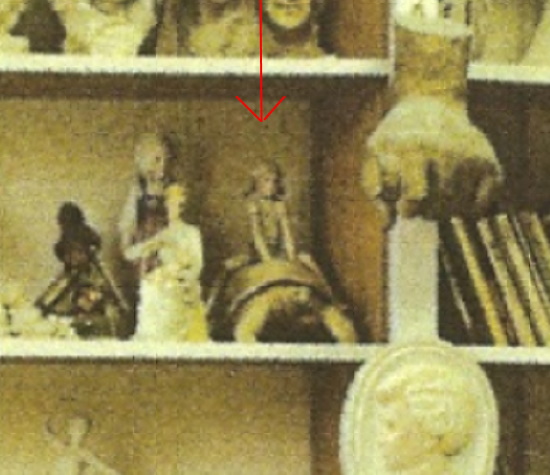 This is a zoomed portion of the shelf section. You can see that this is a young girl riding on a turtle. Just to the left of it is a First Born, Virginia Dare. Because it was very common for Marylin Chorlton to bring various items into the studio for inspiration or modification, these shelves were filled with items that were not just Cybis pieces but could be items from anywhere.