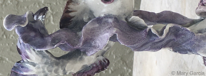 It’s not known whether the entire piece was designed by the Cybis studio or whether this was a similar situation as their first nativity series in which the various figure molds came from a mold company but only some of the decorative elements originated with Cybis. If this piece is a similar ‘hybrid’, it would be the fish mold that was obtained elsewhere (such as, for example, from the Holland Mold or Atlantic Mold companies.) Most decorative examples in this position (with tail raised above back) are dolphins, not fish. Also, many ‘fish’ items from the 1940s and 1950s tend to be rather cartoonish and kitschy, especially the big-mouth styles which were popular imports from Asia.