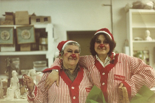 Ginny and Pat hamming it up! On the table at left are two unpainted Persephone; hanging from a top shelf in background are a finished Spring Promise and Summer Dreams. These were all new 1982 introductions.