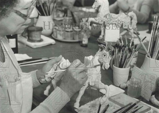 This 1983 or 1984 press photo depicts a decorator working on a Carousel Charger. Press photos were sometimes staged rather than being candids, but notice that in this picture the artist is wearing a smock….which many artists did while doing actual work. The artist in the background is wearing one also. I have been told that these smocks had the Cybis logo on them but have never actually seen one.