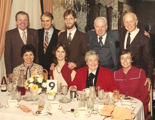 A happy group photo taken at the wedding reception for William Pae and Patricia Haluska in 1985. Seated, from left: Iris Ivers, Laura Lewis, Ginny MacCotter, and Lynn Klockner Brown. Standing, from left: unidentified man; George Ivers; the fiancé (name unknown) of Laura Lewis; an unidentified man; and Joseph Chorlton.