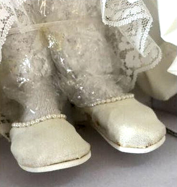 This photo of the ‘bagged’ example shows that she wears lace pantaloons and a lace petticoat beneath her dress. I assume that, like the clown doll, the socks and shoes are permanently affixed and that her feet and/or at least part of her legs are porcelain.