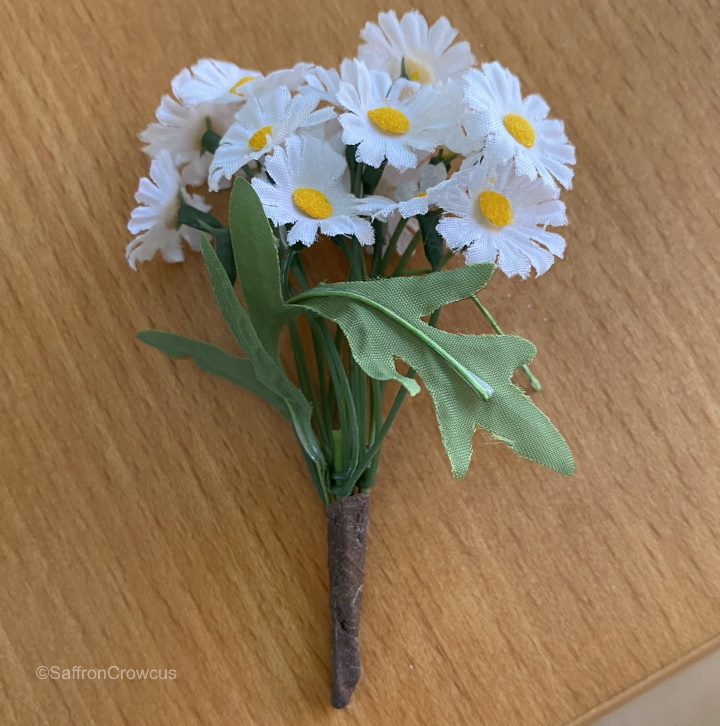 A small bouquet of fabric daisies accompanied the doll; it’s small enough to fit within the doll’s fingers, or be placed in his lap.