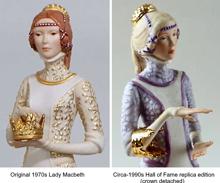 An excellent example of the very different ‘look’ of brilliant vs. matte gold is shown here. The original 1975 edition of Lady Macbeth displays both gold finishes, strategically applied. Matte gold is used for her hair ornament, bodice collar, belt body, and crown body; brilliant gold is applied to her gown’s detail pattern, as tiny accents along her belt, and as highlight details on the crown. The overall effect is of opulence. However, this 1990s Hall of Fame version eliminates all gold except for her hair ornament and crown, which are entirely done via the glaze-then-gold method. The rather tawdry (in my opinion) effect of the two shiny gold elements is made even worse by the choice of purple shades for this edition’s clothing and accessories.