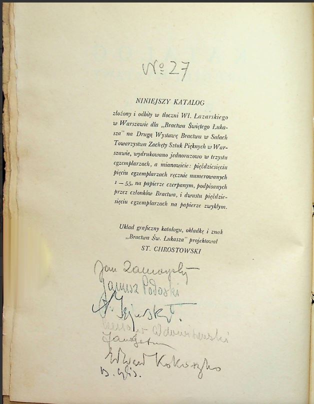 THIS CATALOG was bound and printed at W. Lazarski’s printing company in Warsaw for The Brotherhood of Saint Luke for the second exhibition in the rooms of the Society for the Encouragement of Fine Arts in Warsaw, printed in three hundred copies, namely: fifty-five copies hand numbered 1-55, on handmade paper, signed by members of the Brotherhood, and two hundred fifty copies on plain paper.