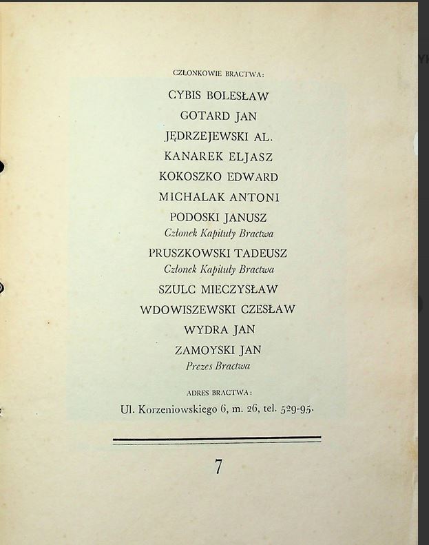 This page lists the members in alphabetical order. Pruszkowski and Podowski are captioned as “(Founding) Member of the Chapter Brotherhood”, and Jan Zamoyski as President of the Brotherhood.