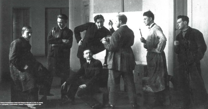 The initial roster of members was Boleslaw Cybis (at far right in this 1925 photo, smoking a pipe), Jan Gotard, Aleksander Jedrzejewski, Eliasz Kanarek, Edward Kokoszko, Antoni Michalak, Czeslaw Wdowiszewski, Jan Wydra, and Jan Zamoyski.