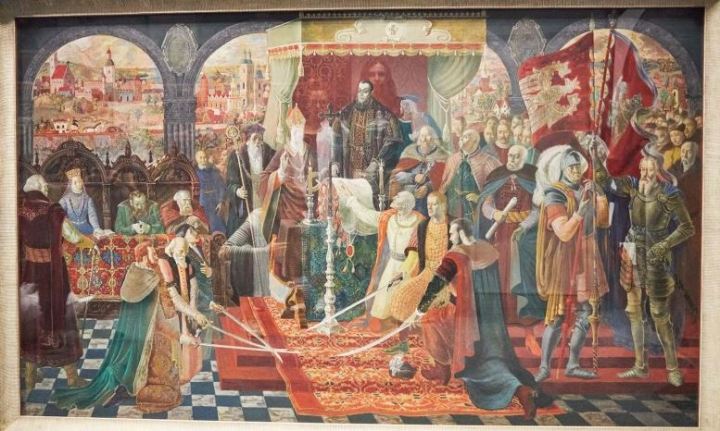 When completed, each of the seven paintings were signed by all eleven Brotherhood artists because all of them had contributed to it in some way. The murals were painted in tempera on canvas and are fully examined in their own Archive post. The example shown here is the Union of Lublin.