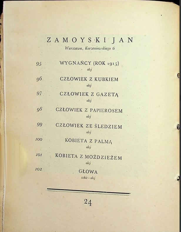 Each illustration of the works in the exhibit was numbered; Zamoyski had numbers 95 – 102. It simply gives the title of the work, and the medium. For instance, #96 is titled Man With a Mug (or perhaps Man Holding a Mug) and the medium is oil. Number 102, titled simply Glowa (Head), is described as sketch-oil.