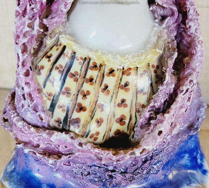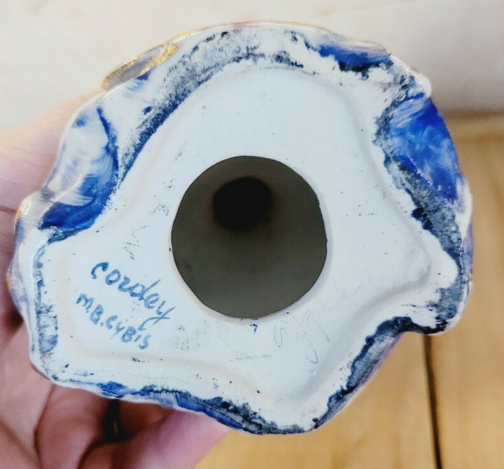 Hallowe’en is just around the corner; what better time to present a screamingly garish example of a dual-signed (Cordey and M.B. Cybis) lady bust? Although most Cordey pieces were not exactly shrinking violets when it came to design, I was truly taken aback by the color choices on this one – especially because it is also signed M.B. Cybis. This example popped up on eBay last year, but I have only summoned up the courage to include it in the Archive now!