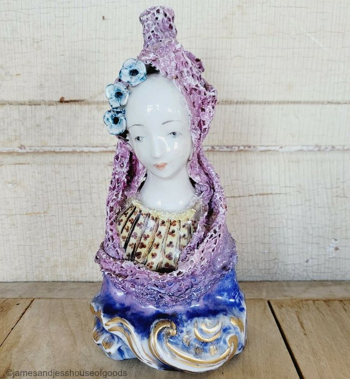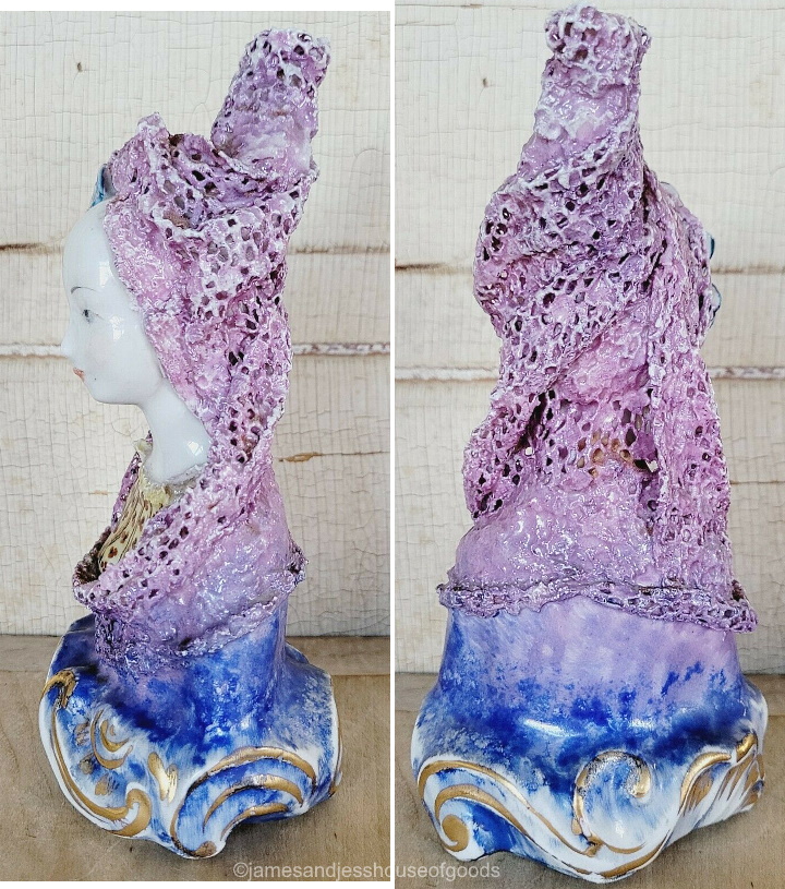 Perhaps a profile or back view will help. Umm, no; not really. Still not sure what that vertical thing is, except that now its shape resembles a toilet-paper roll. (You don’t suppose…. nah, couldn’t be.) And what’s with the purple paint extending past the lace veil/shawl, onto her blue dress? Did she get caught in the rain and experience a ‘dye run’?