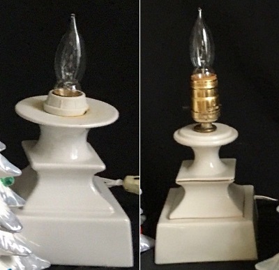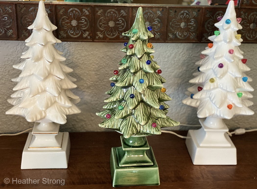 Here are two identical tree molds on different bases and with different mini lights. The tree on the left has pointed bulbs while the “matching” tree on the right has a mixture of round bulbs and pointed ones.