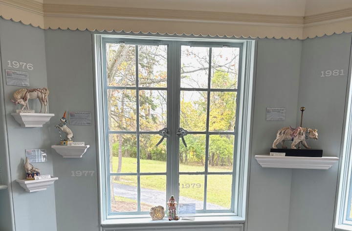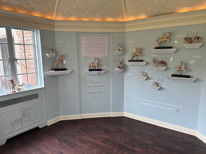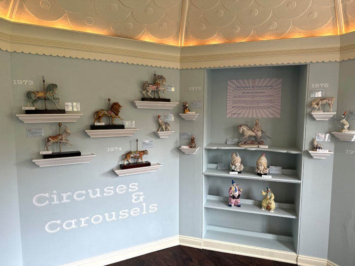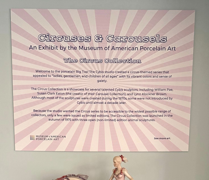 Two of the most popular genre collections from the Cybis studio are the subject of a special exhibit at the Museum of American Porcelain Art in Ohio. The exhibit, titled Circuses & Carousels, is housed – most fittingly – in a room whose construction evokes the inside of a circus tent and/or the top canopy of a carousel! I had the privilege of working closely with the Museum’s curator last year during the preparations for the exhibit.