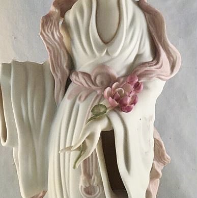There were only 100 of The Bride made, so you probably won’t come across many for sale; but if you do, it’s clear that every part of her elaborate floral headdress, and her long string of pearls, or anywhere on her lace trim, is high-risk for damage. The companion sculpture, Birth at Lowicz, has a similar headdress, and lace trim as well, but not many of those were made.