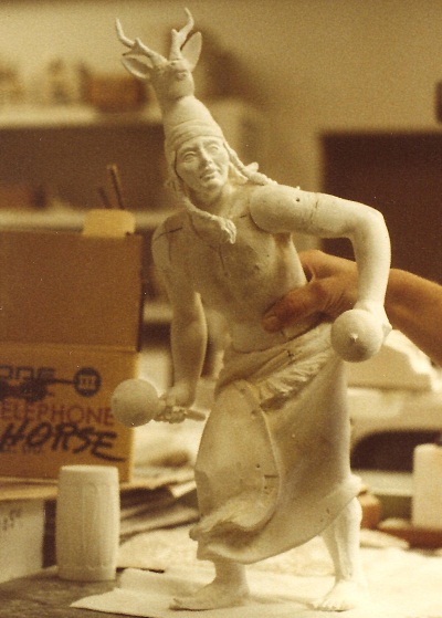 The individual plaster components are then fitted together to make sure that everything comes together properly. This assembled Yaqui ‘Deer Dancer’ shows the pencil-marked guides for proper arm placement as well as small holes and attachment points. These first castings are not fired, and so they are still the same size as the original model.