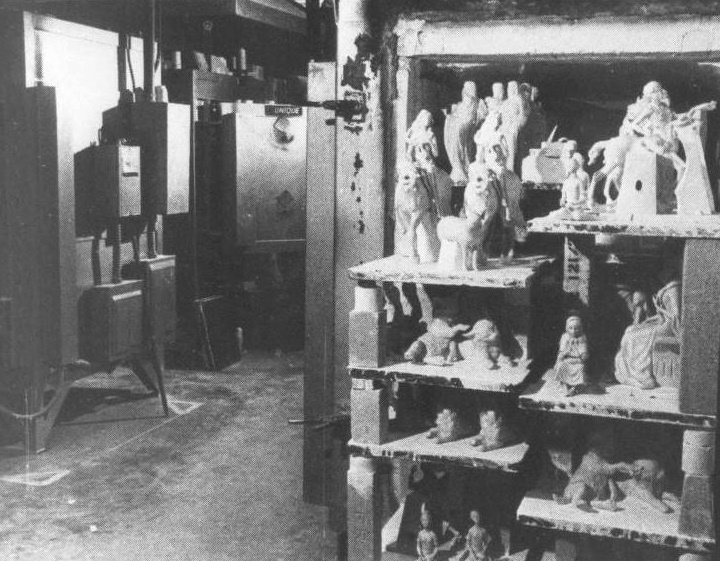 Most studios had their big kilns set on steel rollers so that the sculptures could be assembled and then the kiln body was moved into place around them. This is because moving an extensively propped piece would likely shift the props out of place. The size of the sculptures determined how many could be fired at once time in any particular kiln. Simple sculptures requiring little or no propping could simply be placed by hand into a stationary kiln. This photo, taken inside the Cybis studio in 1983, shows one of the large kilns. Some of the pieces have props but most do not.