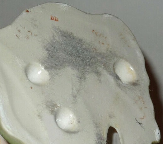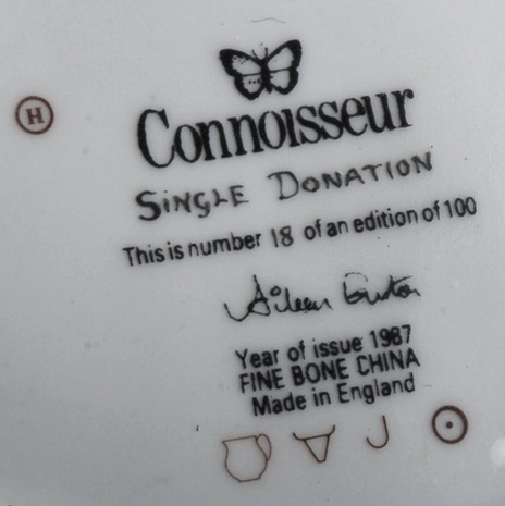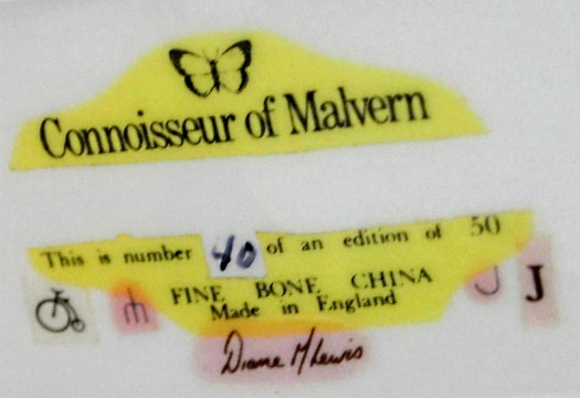 Connoisseur of Malvern took the ‘combination’ approach, with most of their multiple backstamp elements being decals except for the sculpture number and sometimes the edition size. Unlike Boehm, however, the sculpture name was applied by hand in paint almost as often as by decal, as this example shows. The designer’s name (Aileen Burton) is a decal, not a painted signature.