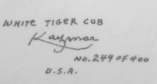 Some studios never used decals at all but instead applied all their marks with paint, either freehand with a brush or with a rubber stamp. Kazmar used the freehand method for all of their “backstamp” information, including the sculpture name and edition information for limited ones.