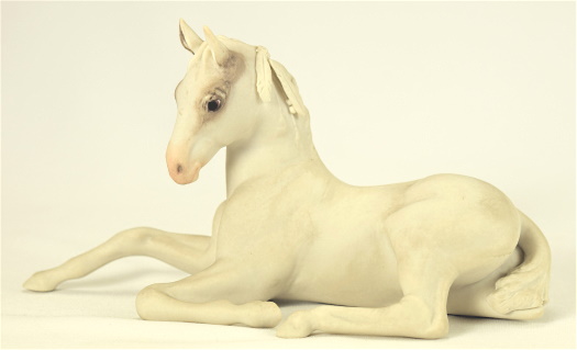 Here is a Pinto Colt in the very first stage of the decorating process. The artist has painted his muzzle as well as the areas around his eyes and ears. This photo has a yellow cast, and the piece itself is dirty from poor storage; the natural color is pure white bisque.