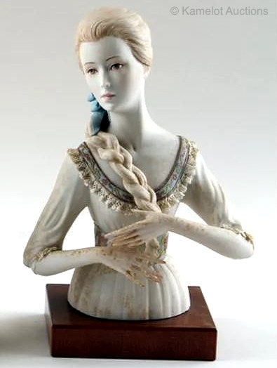 In the same liquidation auction as the Cybis seagull was this truly filthy example of their 1960s Guenevere bust. She looks as if she has been making mud pies! Sadly, she suffered the same poor storage conditions as the seagull but is complicated by having a wood base and dipped-lace trim on her dress collar and cuffs.