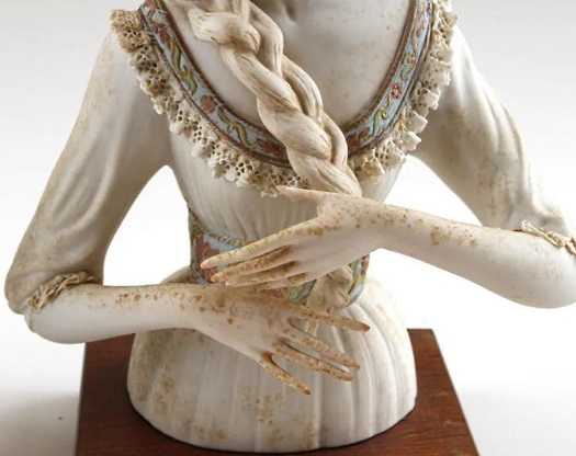In the same liquidation auction as the Cybis seagull was this truly filthy example of their 1960s Guenevere bust. She looks as if she has been making mud pies! Sadly, she suffered the same poor storage conditions as the seagull but is complicated by having a wood base and dipped-lace trim on her dress collar and cuffs.