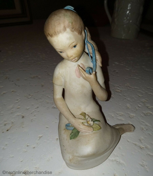 Not the same piece but a clean version, to illustrate how Springtime normally looks. The dirty one was sold on eBay years ago and yes, the seller really did list it like that. A small piece like this one (5” high) can be either dunked carefully or sprayed down. Other than her hair ribbons and little bouquet, the rest of this piece is also wipe-able.