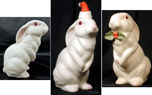 Here are three versions of a Cybis bunny. The standard version (far left) is a perfect candidate for the Wrap method. So is the one with the Santa hat, because although the hat came from a separate mold it was either fired or securely glued in place (most likely the former) and it’s a very simple shape. For the righthand bunny, however, I would definitely use the Free Float method because the holly elements could easily be snapped off by accidental pressure either when wrapping or unwrapping. Even if I was super-careful wrapping it, the recipient might not be.