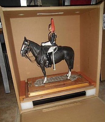 This photo shows how Connoisseur packed ‘Sefton’, one of their limited edition equestrian pieces during the 1980s. This is no mere cardboard box; it is a wooden crate. The lowest part of the box contains the separate black wood base into which the cobblestone-like base portion of the sculpture will fit when displayed. Layers of plywood separate the two sections, the topmost of which is cut to receive the piece which is then firmly anchored down with screws and wood sections on both long sides. No other part of the sculpture is contacted by anything at all; if you were to turn the crate upside down or on any side, the sculpture would remain firmly anchored in place. This is the “platinum standard” of packaging for transport.