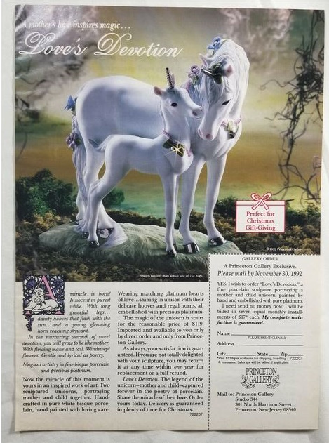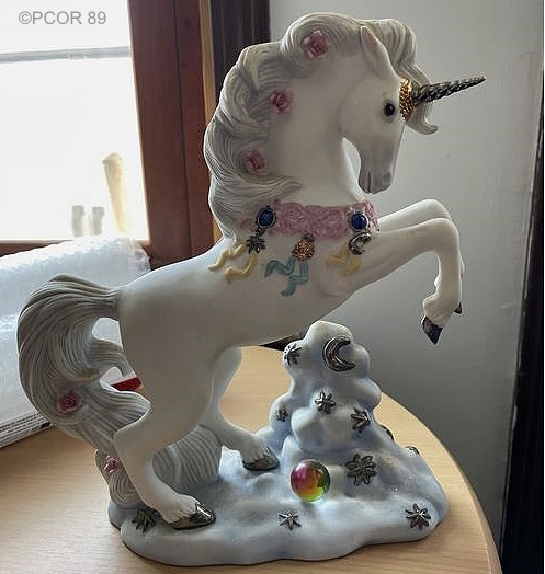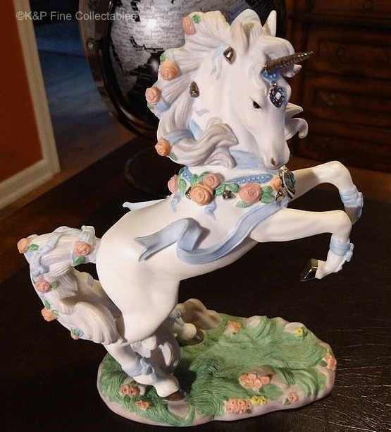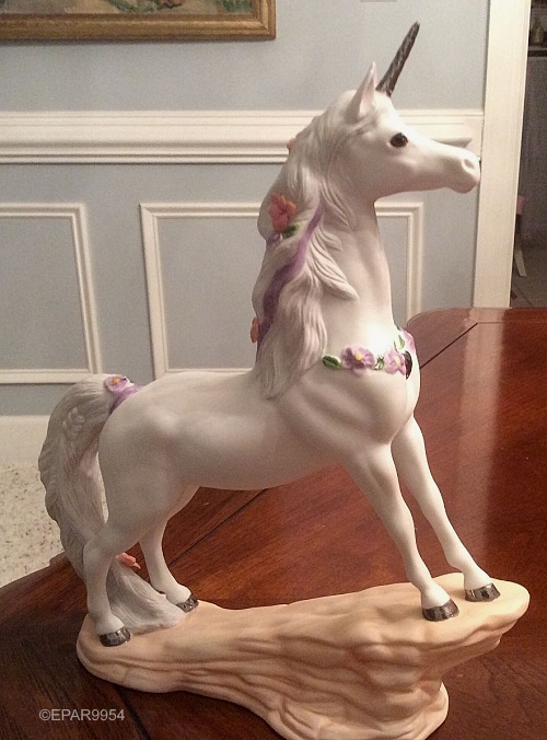 Sue Eaton designed a series of 13 unicorns for Lenox/Princeton Gallery. The figures were created in Taiwan and marketed as their Unicorn Sculpture Collection, starting in 1989. The first of the series, Love’s Delight, racked up a cool $5 million in net profit for Lenox Inc.! In chronological order of retail release, they are: