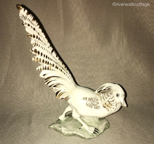 Among the earliest of the Cybis-marked porcelain birds (the papka ones were earlier) are these examples of a fowl which is probably the small pheasant mentioned in a name-only sculpture list in the 1974 Cybis catalog. Each is marked in blue paint M.B. Cybis and MC (for Marja Cybis); a photo of the underside is in the Early Birds post. This is a representation of the Golden Pheasant rather than the more familiar Ring-Necked Pheasant; the telltale hints are the large wattles and the crest, neither of which the Ring-Necked has.