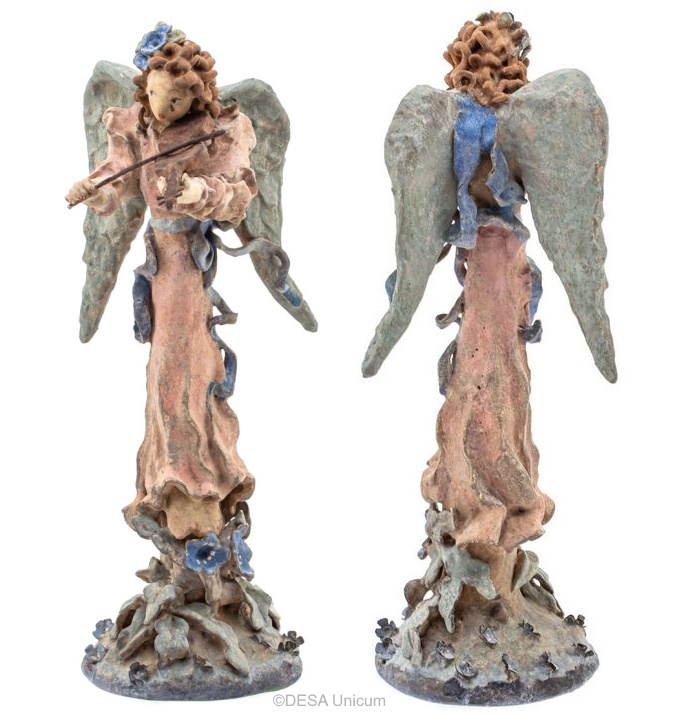 This Violinist, sold at the studio’s 2019 liquidation auction, is signed both ways and dated 1940. Although many other 1940s items had modern signatures applied by the Chorlton studio after 1990, this is definitely not one of them because those later-added signatures were always applied in the modern Cybis script style along with the copyright symbol. That 1940 date means that this angel was made during the very first full year of the Cybis studio in America.
